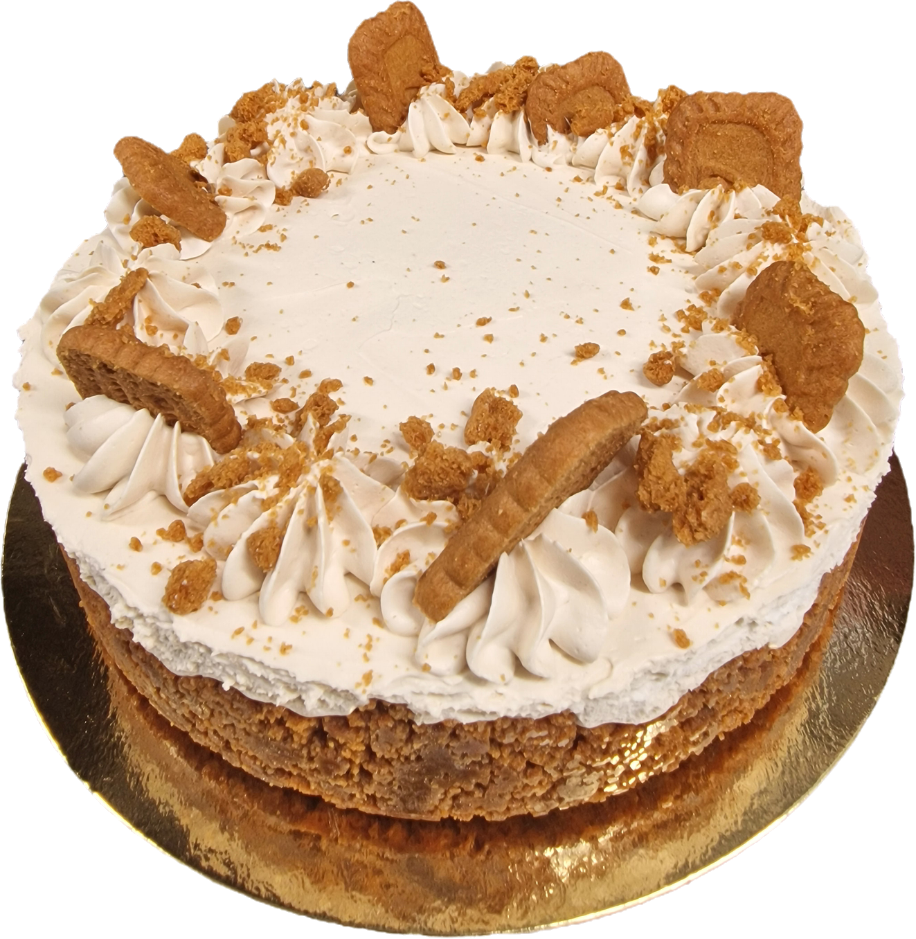Vegaaninen karamellikeksitahnasta, soijavispistä ja soijalevitteestä valmistettu tuore"juusto"kakku.